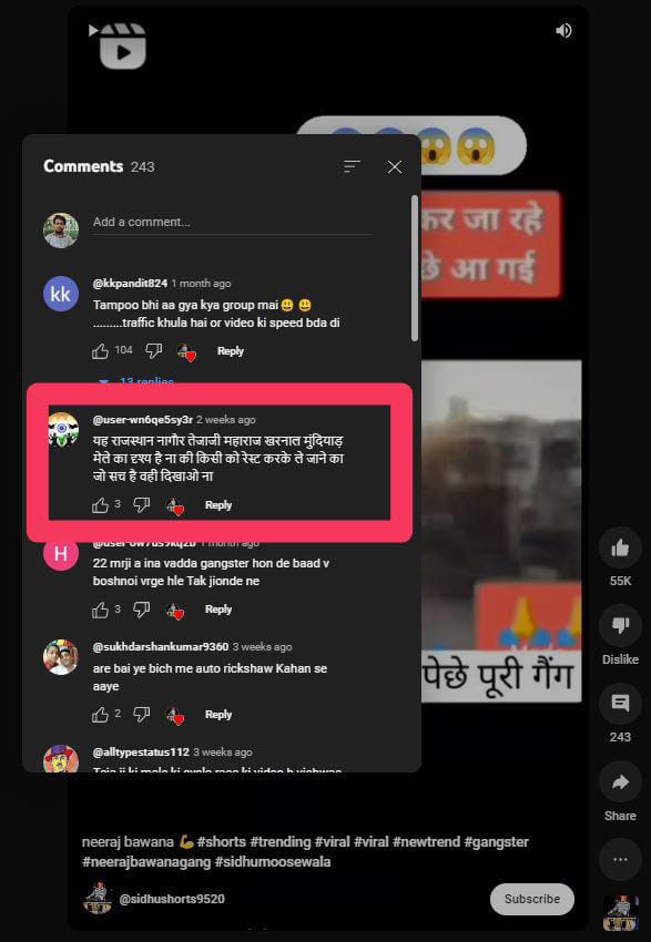 दावे की सत्यता जानने के लिए हमने कुछ कीवर्ड्स की मदद से यूट्यूब पर सर्च किया। हमें 6 महीने पहले अपलोड किया गया एक वीडियो मिला। वीडियो के कमेंट में लिखा था, यह राजस्थान के नागौर जिले के तेजाजी खरनाल मुंदियाड़ मेले का दृश्य है।