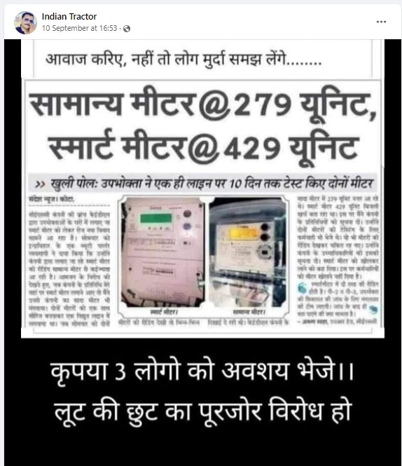 सोशल मीडिया पर अख़बार की एक कटिंग वायरल हो रही है. “सामान्य मीटर@279 यूनिट, ’स्मार्ट मीटर@429 यूनिट” हेडिंग के साथ मौजूद खबर की कटिंग में राजस्थान के कोटा में स्मार्ट इलेक्ट्रिसिटी मीटर की ख़ामियों का ज़िक्र किया गया है. इस अख़बार की कटिंग को हालिया बताकर शेयर किया जा रहा है.
