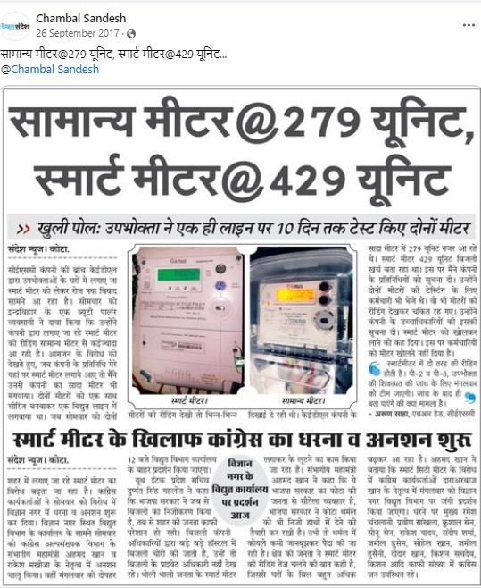इस दौरान हमने चंबल संदेश के एडिटर संजय शर्मा से संपर्क किया. उन्होंने हमें बताया कि “यह ख़बर सितंबर 2017 की है. दरअसल उस दौरान स्मार्ट मीटर को लेकर कोटा में विरोध चल रहा था. तभी एक व्यक्ति ने स्मार्ट मीटर की खामियों की शिकायत करते हुए बताया था कि उनके यहां स्मार्ट मीटर में सामान्य मीटर की तुलना में 150 यूनिट ज्यादा रीडिंग आई है. बाद में कोटा के लोगों का विरोध देखते हुए केईडीएल ने स्मार्ट मीटर लगाना बंद कर दिया था”.