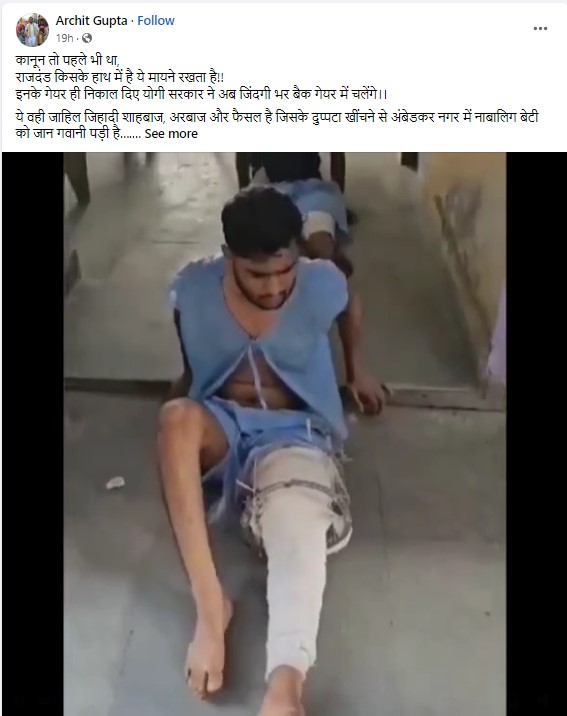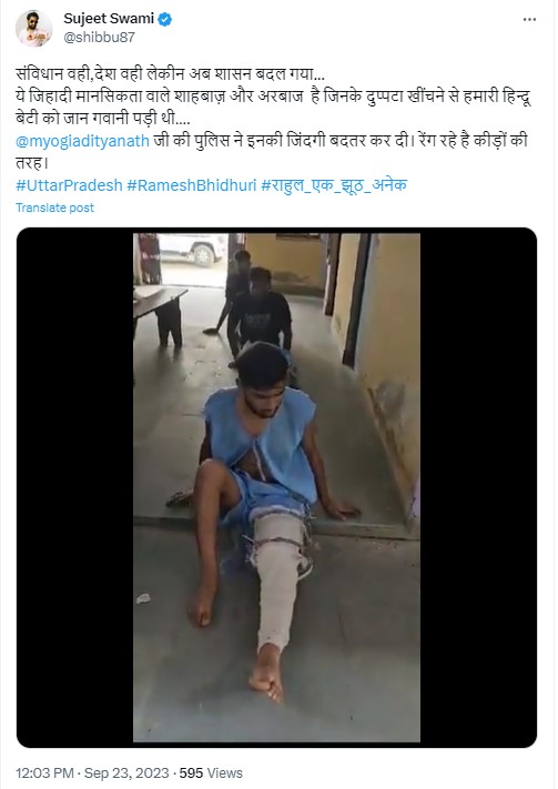 वीडियो के साथ कैप्शन में लिखा हुआ है, “ये जिहादी मानसिकता वाले शाहबाज़ और अरबाज है जिनके दुप्पटा खींचने से हमारी हिन्दू बेटी को जान गवानी पड़ी थी. योगी आदित्यनाथ जी की पुलिस ने इनकी जिंदगी बदतर कर दी. रेंग रहे है कीड़ों की तरह”.
