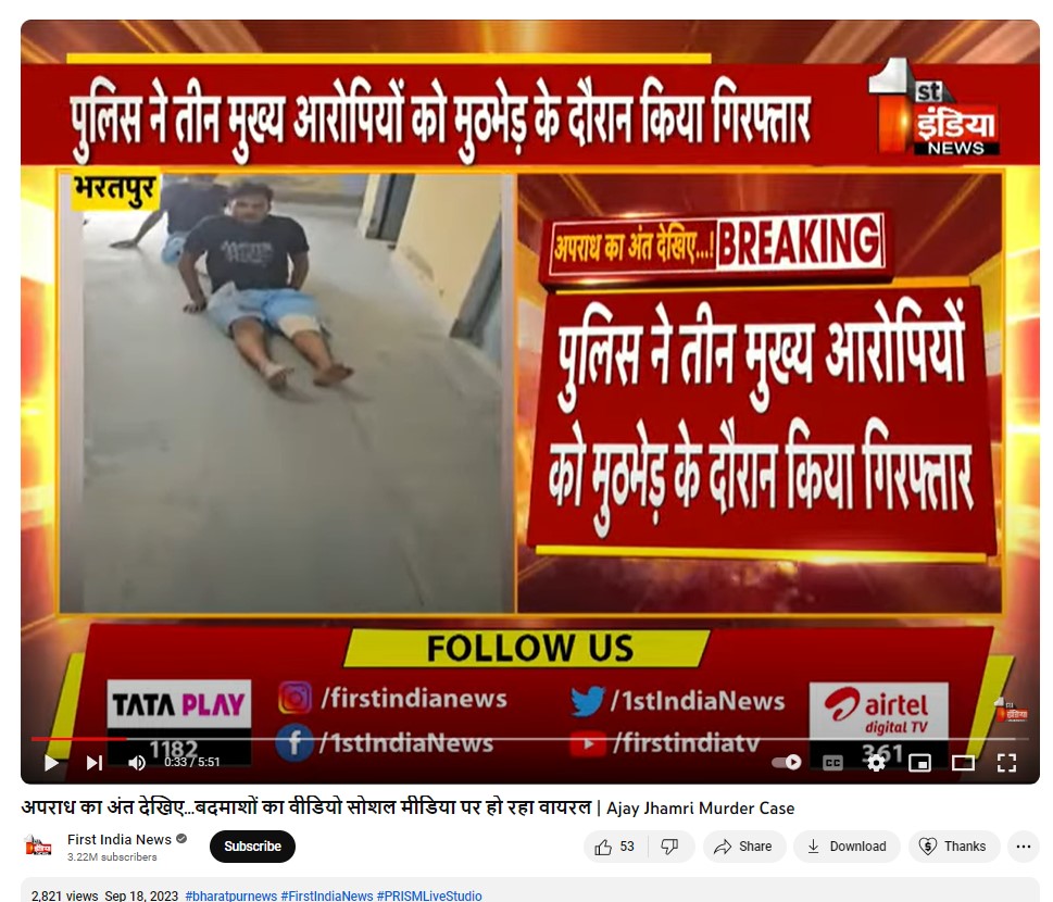 रिवर्स इमेज सर्च में हमें First India News के यूट्यूब अकाउंट पर 18 सितंबर 2023 को अपलोड की गई वीडियो रिपोर्ट मिली. इस रिपोर्ट में वायरल वीडियो भी मौजूद है. वीडियो रिपोर्ट के अनुसार, फ़र्श पर रेंग कर चल रहे तीनों युवक राजस्थान के भरतपुर में पिछले दिनों हुए अजय झामरी हत्याकांड में आरोपित थे. गिरफ़्तारी के दौरान पुलिस के साथ हुई मुठभेड़ में आरोपियों के पैर में गोली लगी थी.