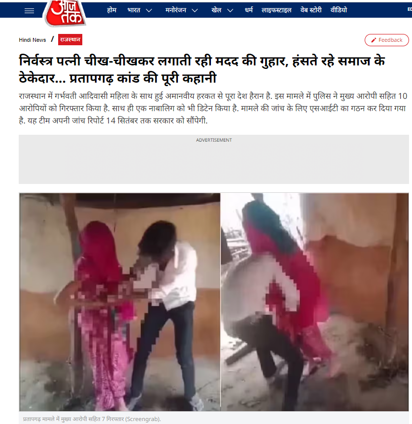 जांच में हमें आजतक की वेबसाइट पर भी 2 सितंबर 2023 को प्रकाशित की गई इस घटना से संबंधित रिपोर्ट मिली. रिपोर्ट में यह बताया गया था कि राजस्थान पुलिस ने 12 घंटे में मुख्य आरोपी महिला के पति समेत अन्य सभी आरोपियों को गिरफ्तार कर लिया था. मुख्य आरोपी कान्हा पुत्र लालिया के अलावा नाथू पुत्र नगजी मीणा, वेणिया पुत्र भेरा, पिन्टू पुत्र भेरीया, खेतिया पुत्र लेम्बिया मीणा, मोती लाल पुत्र रामा मीणा, पुनिया पुत्र बाबरीया मीणा, केसरा पुत्र मानेंग मीणा, सुरज पुत्र केसरा और नेतिया पुत्र पांचिया को गिरफ्तार किया गया था. पुलिस ने इस मामले में एक नाबालिग को भी डिटेन किया था.