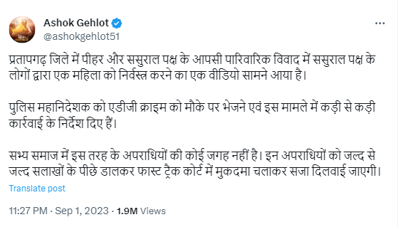 हमें इसके अलावा अशोक गहलोत के आधिकारिक अकाउंट से 1 सितंबर 2023 को किया गया ट्वीट भी मिला. इस ट्वीट में उन्होंने इसे पारिवारिक विवाद बताया था. साथ ही उन्होंने यह भी कहा था कि इन अपराधियों से फास्ट ट्रैक कोर्ट में मुक़दमा चलाकर सजा दिलवाई जाएगी.
