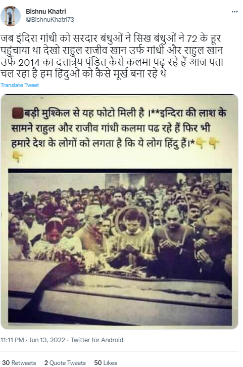 सोशल मीडिया पर एक तस्वीर शेयर कर दावा किया गया कि पूर्व पीएम इंदिरा गांधी के अंतिम दर्शन के दौरान राहुल गांधी कलमा पढ़ रहे थे। वायरल तस्वीर में राहुल के साथ उनके पिता राजीव गांधी और पूर्व पीएम नरसिम्हा राव भी नज़र आ रहे हैं।