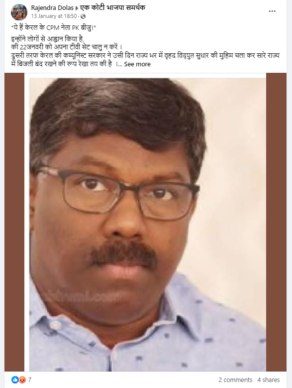 वायरल दावे को एक लंबे कैप्शन के साथ साझा किया जा रहा है, जिसमें लिखा हुआ है “ये हैं केरल के CPM नेता PK बीजु। इन्होंने लोगों से आह्वान किया है की 22जनवरी को अपना टीवी सेट चालु न करें। दुसरी तरफ केरल की कम्यूनिस्ट सरकार ने उसी दिन राज्य भर में वृहद विद्युत सुधार की मुहिम चला कर सारे राज्य में बिजली बंद रखने की रूप रेखा तय की है। 22 जनवरी को पुरे केरल में बिजली सप्लाई बन्द रहेगी,नीचता की भी हद हो गई। हिंदू पर्यटन हेतू केरल मे जाने से पहले सौ बार सोच ले.”