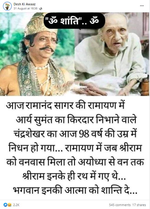 सोशल मीडिया पर एक पोस्ट शेयर कर दावा किया जा रहा है कि रामानंद सागर की ‘रामायण’ में आर्य सुमंत का रोल करने वाले चंद्रशेखर वैद्य का आज निधन हो गया।