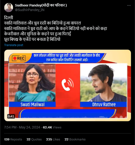 X पर 24 मई 2024 को इस ऑडियो क्लिप को शेयर करते हुए यूज़र ने कैप्शन में लिखा है, ”दिल्ली स्वाति मालिवाल और ध्रुव राठी का वीडियो हुआ वायरल स्वाति मालिवाल ने ध्रुव राठी को आप के कहने पर वीडियो नहीं बनाने को कहा, केजरीवाल और सुनिता के कहने पर हुआ पिटाई, ध्रुव विपक्ष के एजेंडे पर बनाता है वीडियो।” X पोस्ट का आर्काइव यहाँ देखें।