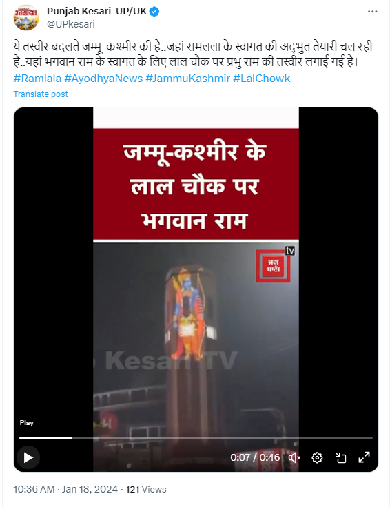 18 जनवरी 2024 को पंजाब केसरी (उत्तर प्रदेश) के आधिकारिक एक्स (पूर्व में ट्विटर) अकाउंट से किये गए एक पोस्ट में लिखा गया है – ये तस्वीर बदलते जम्मू-कश्मीर की है..जहां रामलला के स्वागत की अद्भुत तैयारी चल रही है..यहां भगवान राम के स्वागत के लिए लाल चौक पर प्रभु राम की तस्वीर लगाई गई है। इस दावे के साथ एक वीडियो भी शेयर किया गया है, जहाँ एक घंटाघर पर भगवान राम की तस्वीर लगी दिख रही है। इस जगह को लाल चौक, कश्मीर का बताया जा रहा है। इस पोस्ट का आर्काइव आप यहाँ देख सकते हैं। ऐसे कई पोस्ट यहाँ, यहाँ और यहाँ देखे जा सकते हैं।