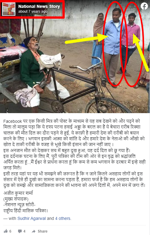 उक्त जानकारी के आधार पर हमने कई कीवर्ड्स को गूगल तथा फेसबुक पर ढूंढा. इस प्रक्रिया में हमें National News Story नामक फेसबुक पेज द्वारा 16 दिसंबर, 2015 को शेयर किए गए पोस्ट में वायरल तस्वीर का एक स्पष्ट वर्जन प्राप्त हुआ, जिसमें उम्रदराज रिक्शा चालक के पास केवल शर्ट पहने दो लोगों को देखा जा सकता है. बता दें कि तस्वीर के विवरण के अनुसार रिक्शा चालक की मृत्यु दिल का दौरा पड़ने से हुई थी.