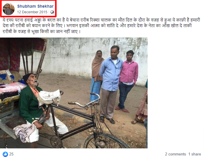Shubham Shekhar नामक फेसबुक यूजर ने भी 12 दिसंबर, 2015 को इसी तस्वीर को पटना एयरपोर्ट के आसपास दिल का दौरा पड़ने से वृद्ध रिक्शा चालक की मृत्यु का बताकर शेयर किया था.