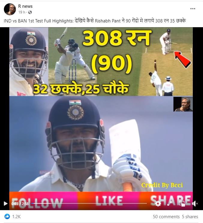 कुल मिलाकर भारत और बांग्लादेश के बीच हुए टेस्ट मैच में ऋषभ पंत ने तिहरा शतक नहीं लगाया था। गलत दावा वायरल हो रहा है।