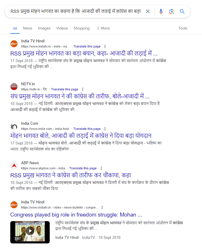 लोकसभा चुनावों के बीच आरएसएस के सरसंघचालक मोहन भागवत द्वारा कांग्रेस की प्रशंसा के नाम पर शेयर किए जा रहे इस दावे की पड़ताल के लिए हमने ‘RSS प्रमुख मोहन भागवत का कहना है कि आजादी की लडाई में कांग्रेस का बड़ा योगदान रहा है’ कीवर्ड्स को गूगल पर ढूंढा. इस प्रक्रिया में हमें यह जानकारी मिली कि यह खबर साल 2018 की है.
