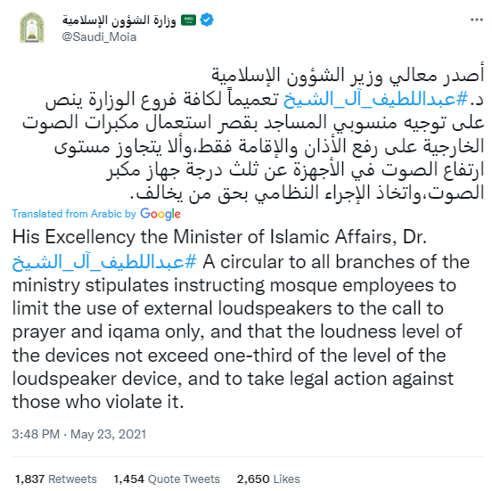 Tweet shared by the Saudi Ministry of Islamic Affairs, Dawah and Guidance on 23 May, 2021