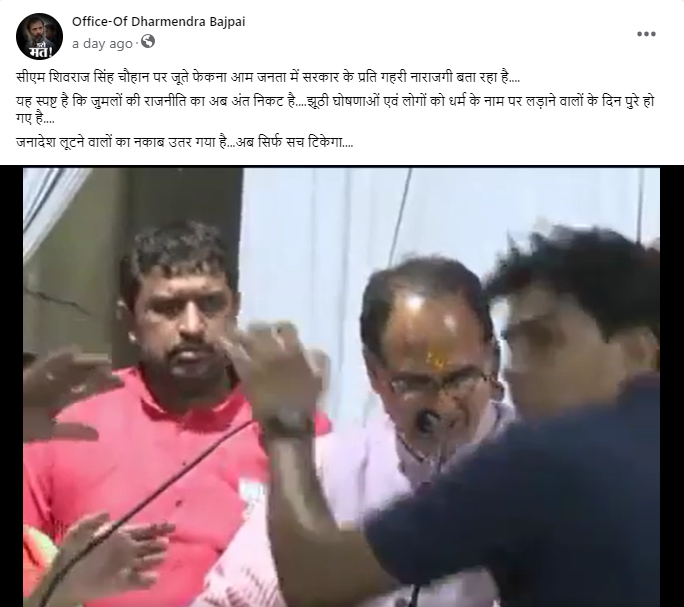 मध्य प्रदेश के मुख्यमंत्री शिवराज सिंह चौहान पर जूता फेंके जाने के दावे से वायरल हुआ यह वीडियो फेसबुक सहित एक्स (ट्विटर) पर भी तेजी से शेयर किया जा रहा है। दावे की पड़ताल के लिए वीडियो के एक कीफ्रेम को गूगल रिवर्स करने पर हमें नवभारत टाइम्स ऑनलाइन के फेसबुक पेज पर यह वीडियो मिला। मीडिया संस्थान के इस पेज पर यह वीडियो 3 सितम्बर 2018 को प्रकाशित किया गया है। वीडियो के साथ दी गई जानकारी के मुताबिक, एक सार्वजनिक कार्यक्रम के दौरान किसी व्यक्ति ने शिवराज सिंह पर जूता फेंका था।