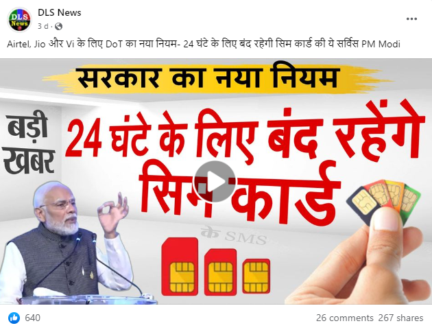 भारत में दूरसंचार की बढ़ती लोकप्रियता तथा लोगों की इस पर निर्भरता का फायदा उठाकर धोखाधड़ी करने वालों ने कई लोगों के साथ फर्जीवाड़ा किया है. इसी क्रम में सोशल मीडिया यूजर्स एक वीडियो शेयर कर यह दावा कर रहे हैं कि केंद्र सरकार द्वारा जारी नए नियमों के अनुसार, देश में सभी सिम कार्ड 24 घंटे के लिए बंद रहेंगे.