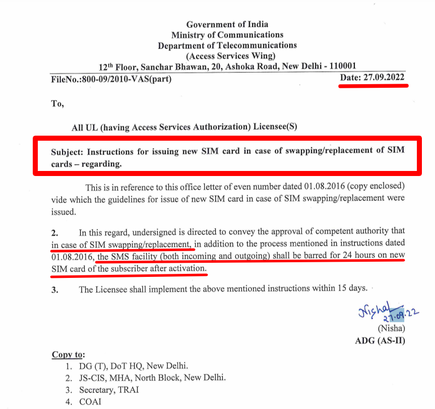 Instructions published by Department of Telecommunications, GoI for issuing new SIM card in case of swapping/replacement of SIM cards on 27 September, 2022 and 1 August, 2016