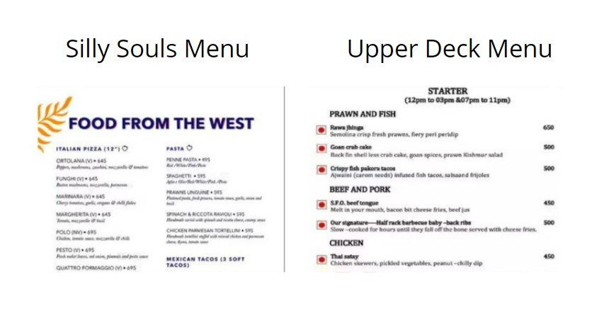 दावे की सत्यता जानने के लिए हमने Silly Souls के मेन्यू को Zomato पर सर्च किया। इस दौरान हमें जो मेन्यू की तस्वीरें नज़र आई वो वायरल तस्वीर से काफी अलग है। इसके बाद हमने वायरल तस्वीर को गूगल रिवर्स सर्च की मदद से खोजना शुरू किया। इस दौरान हमें eazydinner नामक वेबसाइट पर एक तस्वीर मिली जोकि गोवा के Radisson Blu Resort में मौजूद Upper Deck रेस्टोरेंट की है। इस वेबसाइट पर मिली तस्वीर और सोशल मीडिया पर वायरल तस्वीर दोनों लगभग एक हैं। दोनों तस्वीरों का तुलनात्मक विश्लेषण करने पर स्पष्ट है कि दोनों तस्वीरों में लिखा मेन्यू एक है।