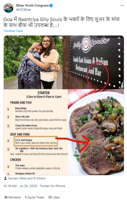 केंद्रीय मंत्री स्मृति ईरानी की बेटी पर गोवा में अवैध बार चलाने के आरोपों के मद्देनजर सोशल मीडिया पर एक पोस्ट काफी वायरल हो रही है। दावा है कि स्मृति की बेटी के रेस्टोरेंट में बीफ और पोर्क परोसा जा रहा है। वायरल पोस्ट में एक रेस्टोरेंट के मेन्यू की तस्वीर है, जिसमें बीफ और पोर्क का जिक्र है। कहा जा रहा है कि ये वही Silly Souls Cafe का मेन्यू है जिसे स्मृति की बेटी चलाती हैं।