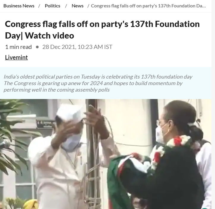 वायरल हो रहे वीडियो का सच जानने के लिए हमने इसके एक कीफ्रेम को रिवर्स सर्च किया। इस दौरान हमें 28 दिसंबर 2021 ‘लाइव मिंट’ द्वारा प्रकाशित एक खबर प्राप्त हुई। इस खबर में वायरल वीडियो मौजूद है। रिपोर्ट में बताया गया है कि वीडियो में दिख रहा झंडा (चरखा छपा हुआ) उस समय गिरा जब कांग्रेस की वरिष्ठ नेता सोनिया गांधी कांग्रेस के स्थापना दिवस पर नई दिल्ली मे पार्टी का झंडा फहराने वाली थीं।