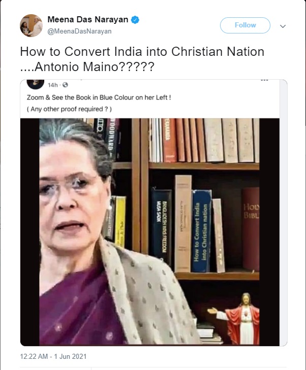 | Claim Review: सोनिया गांधी की बुकशेल्फ में रखी है ईसाई धर्म परिवर्तन की किताब। Claimed By: Meena Das Narayan Fact Check: False |