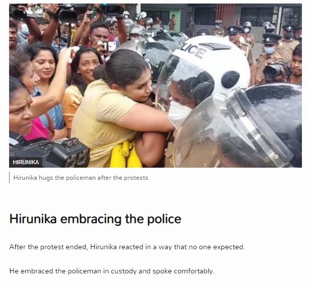 बीबीसी की रिपोर्ट में बताया गया है कि विरोध प्रदर्शन खत्म होने के बाद हिरुनिका प्रेमचंद्रा ने पुलिसवाले को गले लगाया और उनसे आराम से बातचीत की।