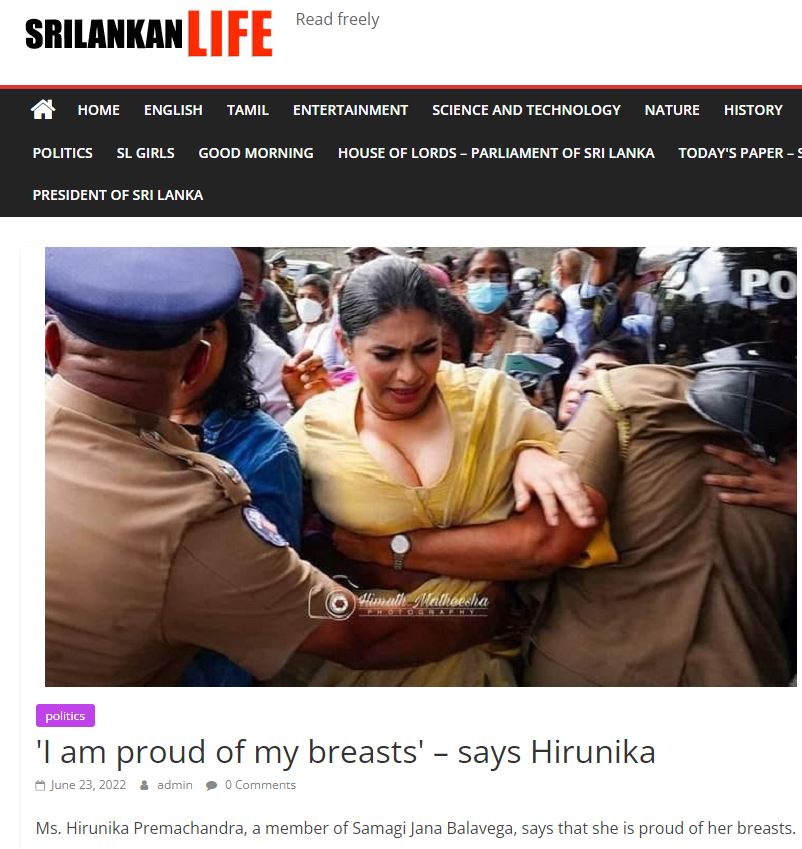 इस जानकारी की मदद से हमने गूगल पर कुछ कीवर्ड सर्च किया। हमें ‘Srilankanlife’ की वेबसाइट पर जून 2022 की एक रिपोर्ट मिली। इसमें वायरल तस्वीर मौजूद है। रिपोर्ट में दी गई जानकारी के मुताबिक, वायरल तस्वीर में नज़र आ रही महिला ‘Samagi Jana Balavega’ की सदस्य हिरुनिका प्रेमचंद्रा (Hirunika Premchandra) हैं। रिपोर्ट के मुताबिक, एक विरोध प्रदर्शन के दौरान कुछ लोगों ने सोशल मीडिया पर उनके ब्रेस्ट का मजाक बनाना शुरू कर दिया था। जिसपर प्रतिक्रिया देते हुए हिरुनिका ने कहा कि उन्हें अपने ब्रेस्ट पर गर्व है।