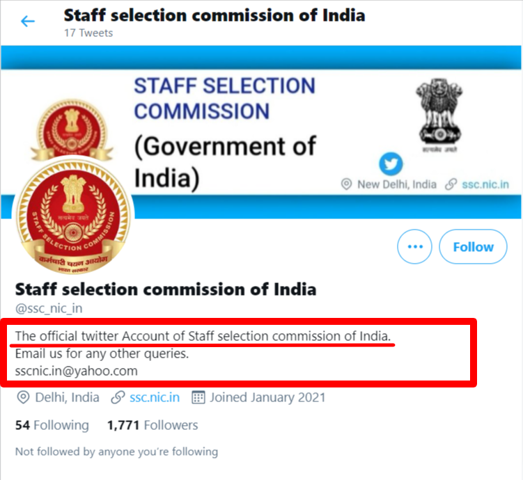 उक्त ट्विटर अकाउंट ने अपने बायो में sscnic.in@yahoo.com को SSC का आधिकारिक ईमेल बताया है. SSC की आधिकारिक वेबसाइट पर मौजूद जानकारी के अनुसार यह ईमेल फर्जी है. SSC ने अपनी वेबसाइट पर आधिकारिक ईमेल्स की सूची प्रकाशित की है. बता दें, उक्त सूची में हमें कोई भी ऐसा ईमेल प्राप्त नहीं हुआ जिसका सर्विस प्रोवाइडर Yahoo हो.