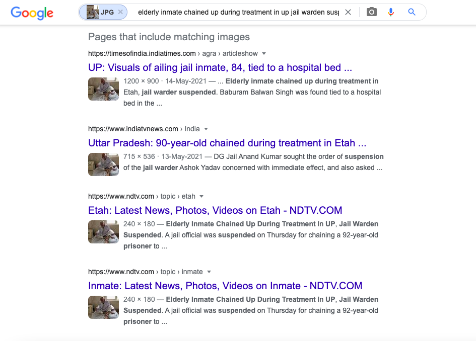 तस्वीर में दिख रहे शख़्स दरअसल 92 साल के बाबूराम बलवान सिंह हैं। बाबूराम खून के जुर्म में यूपी की एटा जेल में सज़ा काट रहे हैं। 13 मई 2021 को NDTV द्वारा प्रकाशित रिपोर्ट के मुताबिक़ बाबूराम को साँस की तकलीफ़ के बाद अस्पताल में भर्ती कराया गया था।