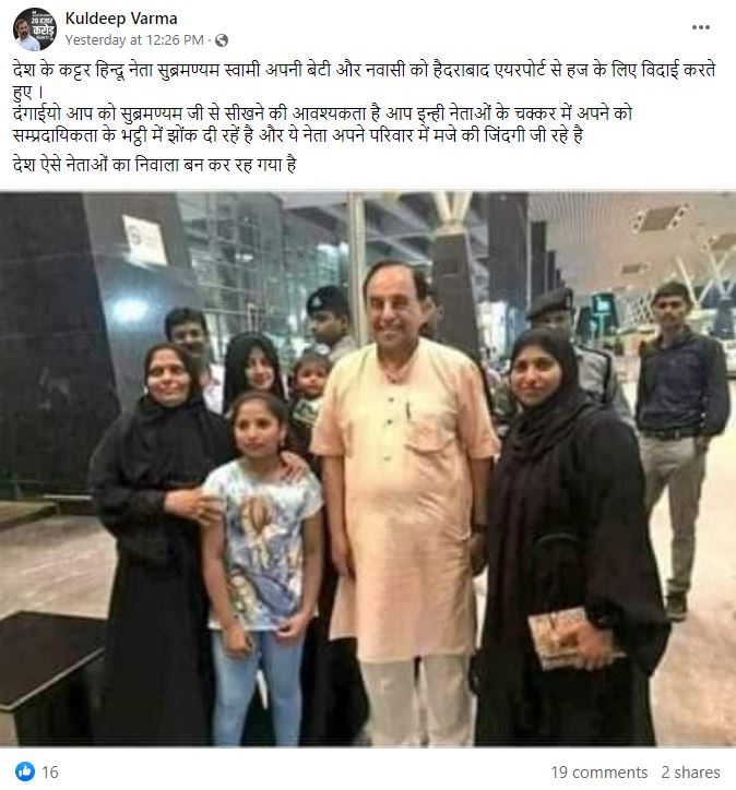 सोशल मीडिया पर पूर्व केंद्रीय मंत्री सुब्रमण्यम स्वामी की एक तस्वीर शेयर कर दावा किया जा रहा कि उन्होंने अपनी बेटी को हज के लिए रवाना किया। वायरल तस्वीर में सुब्रमण्यम स्वामी कुछ बुर्काधारी महिलाओं के साथ नज़र आ रहे हैं और ये हैदराबाद एयरपोर्ट की बताई जा रही है।