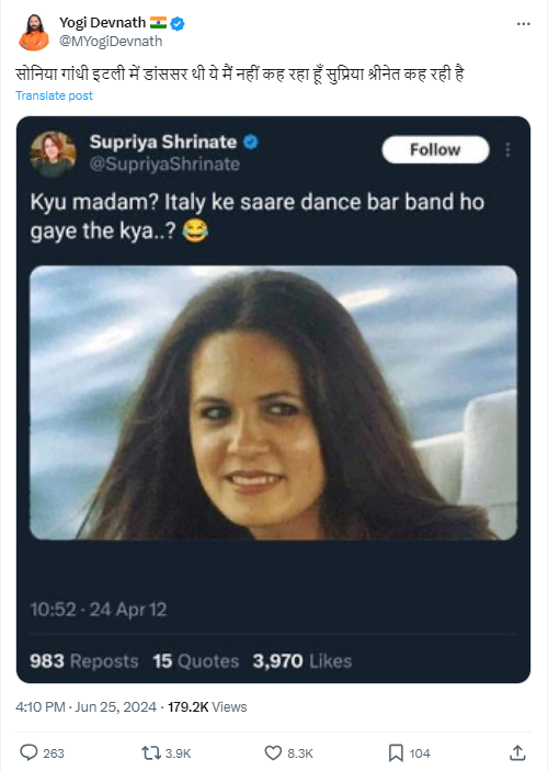इस स्क्रीनशॉट के साथ योगी देवनाथ ने कैप्शन में लिखा है कि, “सोनिया गांधी इटली में डांसर थी, ये मैं नहीं कह रहा हूँ सुप्रिया श्रीनेत कह रही है।” एक्स पोस्ट का आर्काइव यहाँ देखें।
