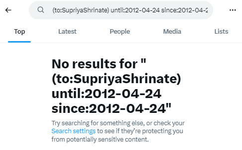 जांच में आगे हमने एक्स एडवांस सर्च की मदद से वायरल स्क्रीनशॉट में नजर आ रहे कैप्शन और 24 अप्रैल 2012 को किया गया पोस्ट खोजा। लेकिन इसके परिणाम में भी हमें सुप्रिया श्रीनेत के एक्स हैंडल पर कुछ नहीं मिला।