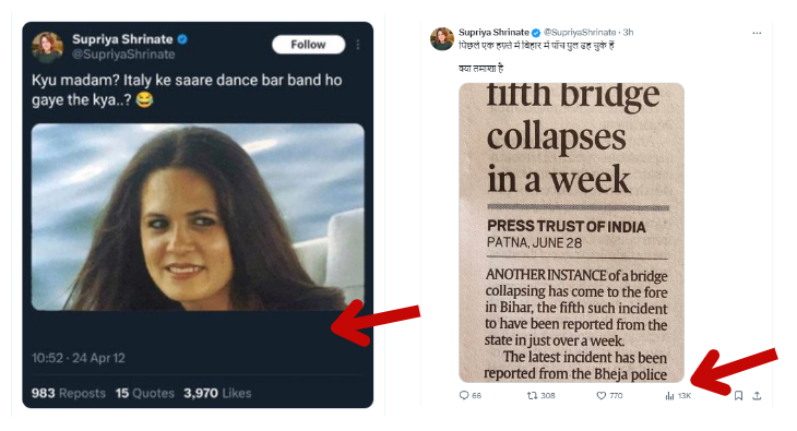 सुप्रिया श्रीनेत कांग्रेस की राष्ट्रीय प्रवक्ता हैं। वे 2019 में ईटी नाउ के कार्यकारी निदेशक पद से इस्तीफा देकर कांग्रेस में शामिल हुई थीं। वायरल स्क्रीनशॉट में नजर आ रहा पोस्ट वर्ष 2012 का है, उस दौरान सुप्रिया श्रीनेत ईटी नाउ, इकनोमिक टाइम्स चैनल में कार्यरत थीं। सुप्रिया श्रीनेत का एक्स अकाउंट देखने पर हम पाते हैं कि 2012 के दौरान लिखे गए उनके पोस्ट ख़ास औपचारिक भाषा और ज्यादातर अंग्रेजी भाषा के हैं।
