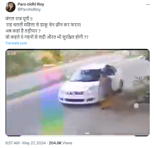 इस वीडियो को वायरल दावे वाले कैप्शन के साथ शेयर किया गया है, जिसमें लिखा हुआ है “जंगल राज यूपी !! राह चलती महिला से डाकू चेन छीन कर फरार! अब कहां है तड़ीपार ? जो कहते थे गहनों से लदी औरत भी सुरक्षित होगी ??”