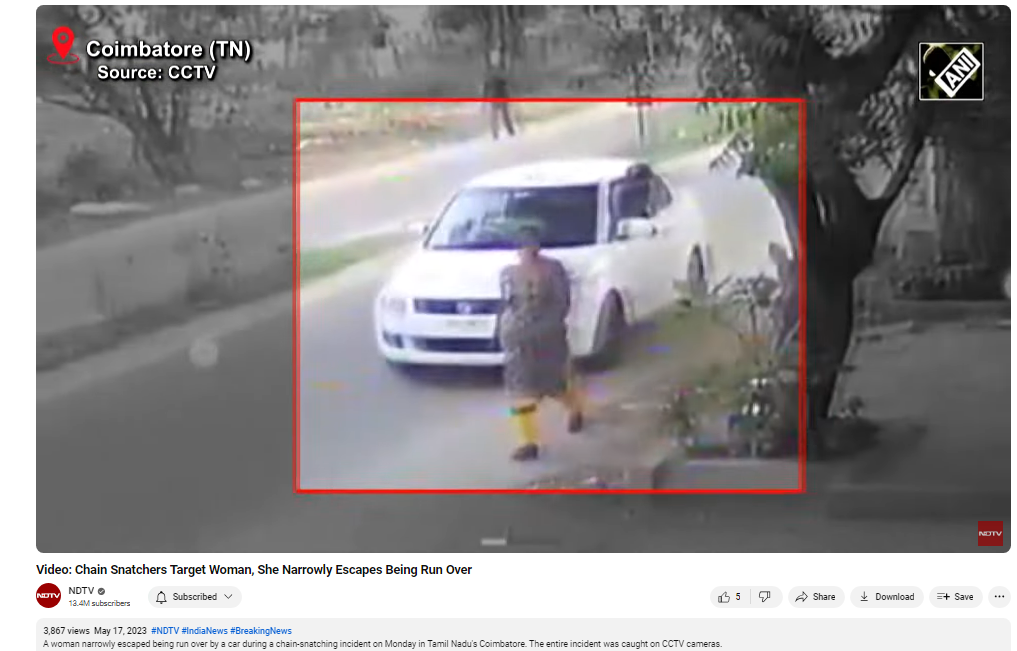 वीडियो के साथ दी गई जानकारी में यह बताया गया था कि तमिलनाडु के कोयंबटूर में दो अराजक तत्वों ने सड़क किनारे गुजर रही एक महिला से चेन छीनने की कोशिश की. हालांकि महिला ने इस दौरान खुद और चेन दोनों को बचा लिया. बाद में पुलिस ने सीसीटीवी फुटेज के आधार पर आरोपियों को गिरफ्तार कर लिया.