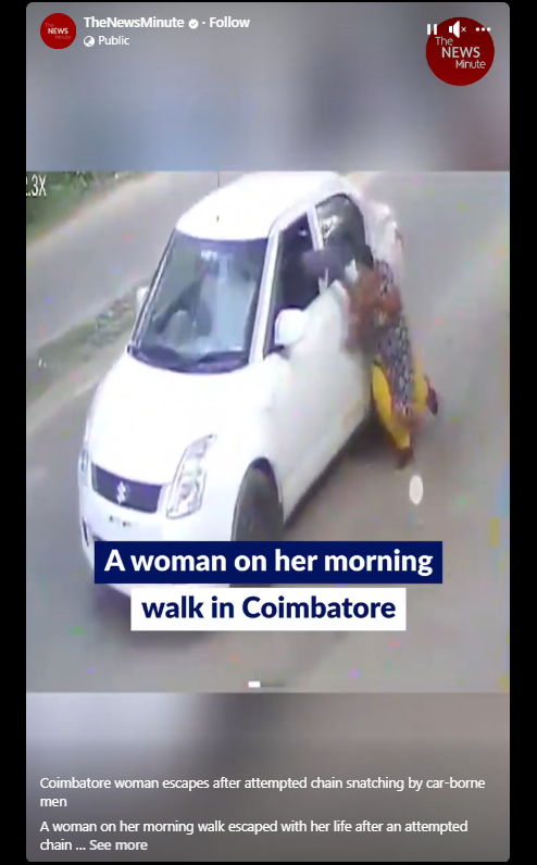 जांच में हमें इस घटना से जुड़ी विस्तृत रिपोर्ट द हिंदू की वेबसाइट पर 16 मई 2023 को प्रकाशित मिली. द हिंदू की रिपोर्ट के अनुसार, कोयंबटूर के हुडको कॉलोनी की रहने वाली आर कौशल्या 15 मई 2023 को मॉर्निंग वाक के लिए जीवी रेसीडेंसी की तरफ गई थी. तभी 6:30 के आसपास एक उजले रंग की कार ने पीछे से आर कौशल्या का पीछा किया और कार में पैसेंजर सीट पर बैठे एक व्यक्ति ने उनके गले से चेन छीनने की कोशिश की.