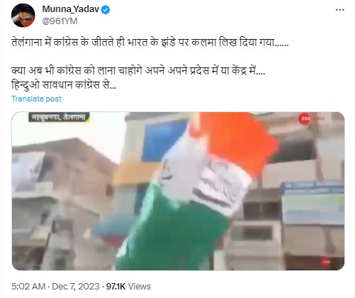 इस वीडियो को X (पूर्व में ट्विटर) पर शेयर करते हुए कैप्शन में लिखा गया है, “तेलंगाना में कांग्रेस के जीतते ही भारत के झंडे पर कलमा लिख दिया गया. क्या अब भी कांग्रेस को लाना चाहोगे अपने अपने प्रदेस में या केंद्र में.हिन्दुओ सावधान कांग्रेस से.”