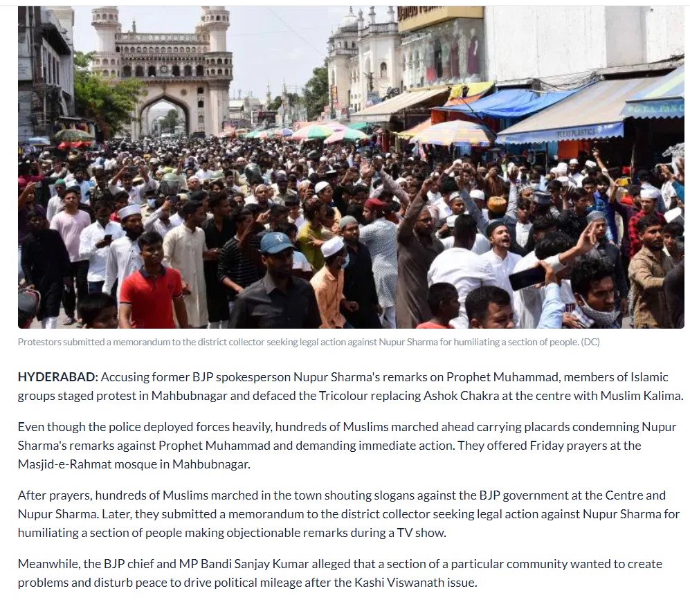 पड़ताल के दौरान हमें डेक्कन क्रोनिकल की वेबसाइट पर भी 10 जून, 2022 को प्रकाशित एक रिपोर्ट मिली. इस रिपोर्ट में भी बताया गया है कि नूपुर शर्मा के बयान के ख़िलाफ़ महबूबनगर में जुमे की नमाज के बाद विरोध प्रदर्शन आयोजित किया गया था. इस दौरान प्रदर्शनकारियों ने तिरंगे के ऊपर से अशोक चक्र हटाकर उस पर कलमा लिखा दिया था.