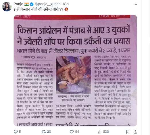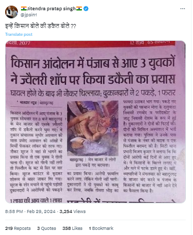 एक एक्स पोस्ट द्वारा 29 फरवरी 2024 को अखबार की इस कटिंग को पोस्ट किया गया है। पोस्ट के कैप्शन में लिखा गया है, ‘इन्हें किसान बोले की डकैत बोले ?’