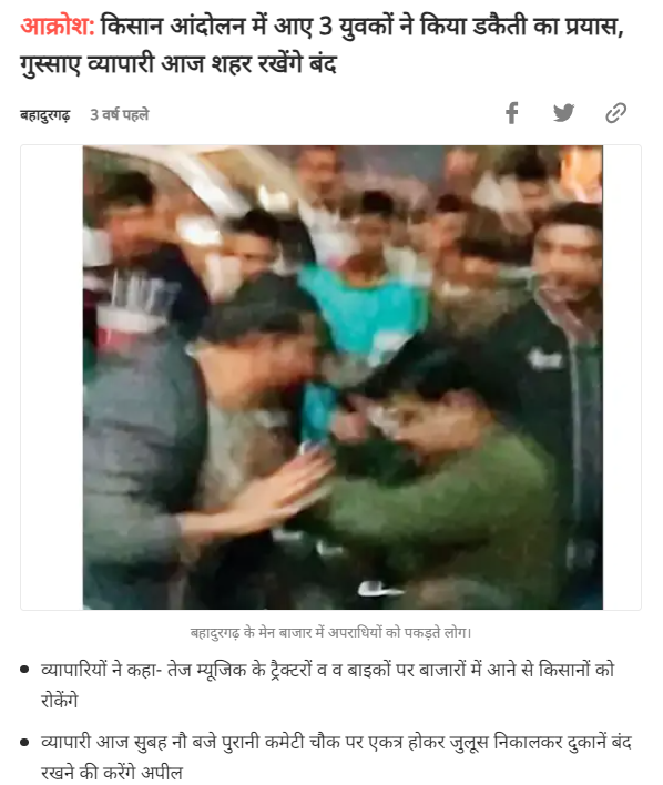 अपनी जांच से हम इस निष्कर्ष पर पहुँचते हैं कि तीन साल पहले किसान आंदोलन की आड़ में पंजाब से आये तीन युवकों द्वारा बहादुरगढ़ में डकैती के प्रयास की घटना को हालिया किसान आंदोलन से जोड़कर भ्रामक दावा शेयर किया जा रहा है।