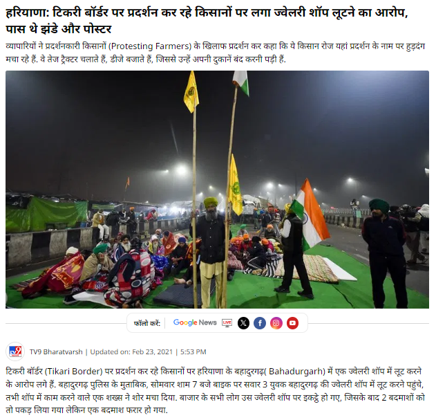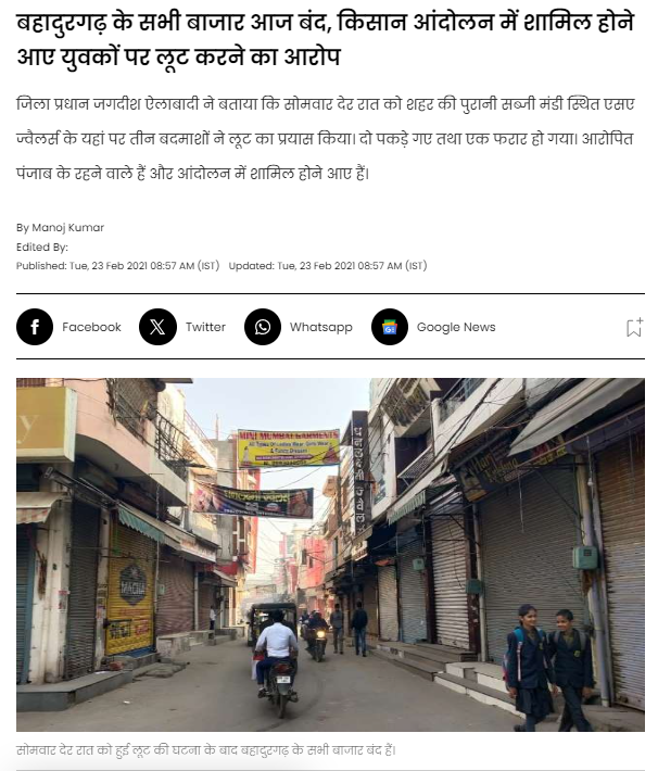 जांच में आगे हम पूरी घटना को समझने के लिए इससे संबंधित और मीडिया रिपोर्ट्स खोजते हैं। परिणाम में हमें 23 फरवरी 2021 को दैनिक जागरण और TV9 भारतवर्ष द्वारा प्रकाशित रिपोर्ट्स मिलती हैं। रिपोर्ट्स में बताया गया है कि यह खबर हरियाणा के बहादुरगढ़ की है। यहाँ बताया गया है कि उस वक़्त पंजाब से किसान आंदोलन में किसानों की आड़ में तीन युवक आ गये थे, जिन्होंने वहां के मेन बाजार में एसके ज्वैलरी नामक दुकान में डकैती का प्रयास किया था।