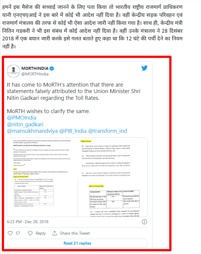 अमर उजाला द्वारा प्रकाशित लेख में हमें Ministry of Road Transport and Highways द्वारा 28 दिसंबर, 2018 को शेयर किया गया एक ट्वीट प्राप्त हुआ. जिसमे वायरल दावे को गलत बताते हुए स्पष्टीकरण जारी किया गया है.