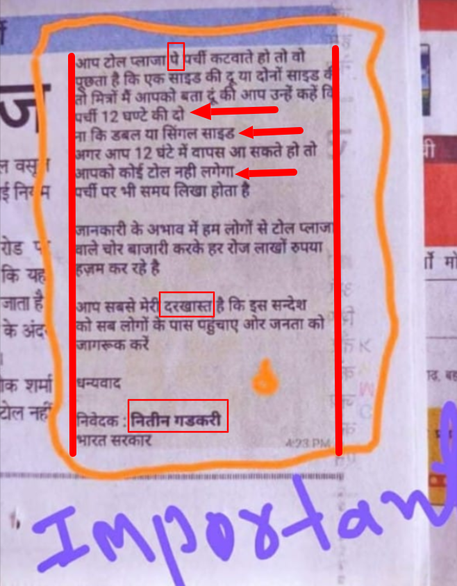 इसी क्रम में महत्वपूर्ण जानकारी बताकर शेयर की जा रही अखबार की एक कटिंग को शेयर कर यह दावा किया गया कि टोल बूथ पर 12 घंटे की पर्ची मांगकर 12 घंटे तक बिना टोल टैक्स दिए यात्रा की जा सकती है.
