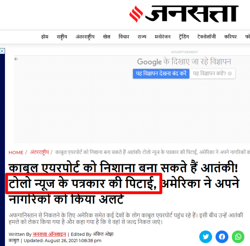 तालिबान द्वारा टोलो न्यूज के पत्रकार जिआर खान याद की हत्या के इस दावे की पड़ताल के लिए, हमने TOLOnews का आधिकारिक ट्विटर पेज जांचा, जहां हमें संस्था द्वारा 26 अगस्त, 2021 को शेयर किया गया एक ट्वीट प्राप्त हुआ. TOLOnews के उक्त ट्वीट के अनुसार (हिंदी अनुवाद), “तालिबान द्वारा TOLOnews एक रिपोर्टर तथा कैमरामैन की पिटाई की गई है.”