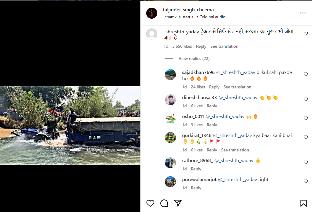 अब हमने वायरल वीडियो में दिख रही ट्राली पर भी PAW के बाद अंग्रेजी में लिखे टेक्स्ट को देखा तो हमें धुंधले तौर पर “CHEEMA AGRI FARM” लिखा हुआ दिखाई दिया. इसके बाद हमने चीमा एग्री फ़ार्म जैसे कीवर्ड की मदद से इंस्टाग्राम सर्च किया. इस प्रक्रिया में हमें कोई ख़ास जानकारी नहीं मिली. लेकिन इसी दौरान हमें “luxury trolley wale” नाम का एक इंस्टाग्राम पेज मिला. इस पेज पर भी पंजाब के आकर्षक ट्रैक्टर और ट्रालियों के फोटोज और वीडियोज मौजूद थे.