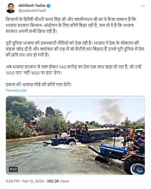 वीडियो को उत्तर प्रदेश के पूर्व मुख्यमंत्री व समाजवादी पार्टी के मुखिया अखिलेश यादव ने किसानों के हालिया दिल्ली कूच से जोड़कर मोदी सरकार पर निशाना साधते हुए यह वीडियो अपने X अकाउंट से शेयर किया है.