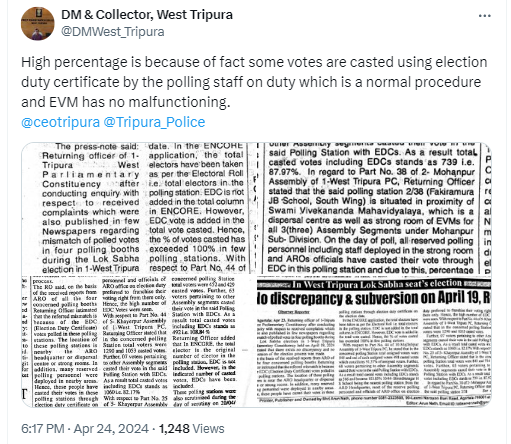 इसके अलावा, हमें वेस्ट त्रिपुरा के डीएम के X अकाउंट से 24 अप्रैल 2024 को किया गया ट्वीट भी मिला, जिसमें उन्होंने ईवीएम में गड़बड़ी की वजह से 100% से ज्यादा वोटिंग होने वाले दावे का खंडन किया था. अंग्रेज़ी में किए गए इस ट्वीट का हिंदी अनुवाद है, “ उच्च प्रतिशत का कारण यह है कि कुछ वोट ड्यूटी पर तैनात मतदान कर्मचारियों द्वारा इलेक्शन ड्यूटी सर्टिफिकेट का उपयोग करके डाले गए हैं जो एक सामान्य प्रक्रिया है और ईवीएम में कोई खराबी नहीं है”.