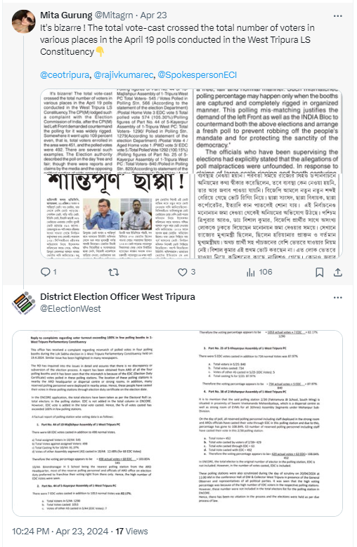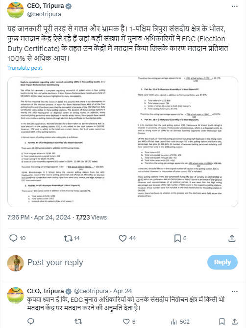वायरल दावे वाले कुछ ट्वीट्स को खंगालने पर हमें त्रिपुरा वेस्ट के जिला निर्वाचन अधिकारी के X अकाउंट से 23 अप्रैल 2024 को किया गया रिप्लाई मिला. रिप्लाई में इस संबंध में जारी किया गया प्रेस रिलीज मौजूद था.