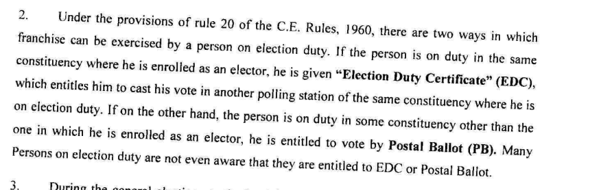इसके अलावा हमें Election Duty Certificate के संबंध में चुनाव आयोग द्वारा 7 मार्च 2014 को जारी किया गया गाइडलाइन भी मिला. इस गाइडलाइन में लिखा हुआ था, “निर्वाचन नियम 1960 के नियम 20 के प्रावधानों के तहत, चुनाव ड्यूटी पर तैनात व्यक्ति द्वारा मताधिकार का प्रयोग दो तरीकों से किया जा सकता है. यदि व्यक्ति उसी निर्वाचन क्षेत्र में ड्यूटी पर है जहां वह निर्वाचक(मतदाता) के रूप में नामांकित है, तो उसे “इलेक्शन ड्यूटी सर्टिफिकेट” (ईडीसी) दिया जाता है, जो उसे उसी निर्वाचन क्षेत्र के किसी अन्य मतदान केंद्र पर अपना वोट डालने का अधिकार देता है जहां वह चुनाव ड्यूटी में है. दूसरी ओर, यदि व्यक्ति उस निर्वाचन क्षेत्र के अलावा किसी अन्य निर्वाचन क्षेत्र में ड्यूटी पर है, जिसमें वह मतदाता के रूप में नामांकित है, तो वह पोस्टल बैलेट द्वारा मतदान करने का हकदार है”.