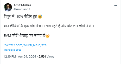 पोस्ट के कैप्शन में लिखा गया है, “त्रिपुरा में 110% पोलिंग हुई, मान लीजिये कि एक गांव में 100 लोग रहते हैं और वोट 110 लोगों ने की. EVM कोई भी जादू कर सकता है”.
