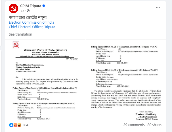 इतना ही नहीं कम्युनिस्ट पार्टी ऑफ़ इंडिया (मार्कसिस्ट) के त्रिपुरा सचिव जितेंद्र चौधरी ने 22 अप्रैल 2024 को इस संबंध में मुख्य चुनाव आयुक्त को भी पत्र लिखा था.